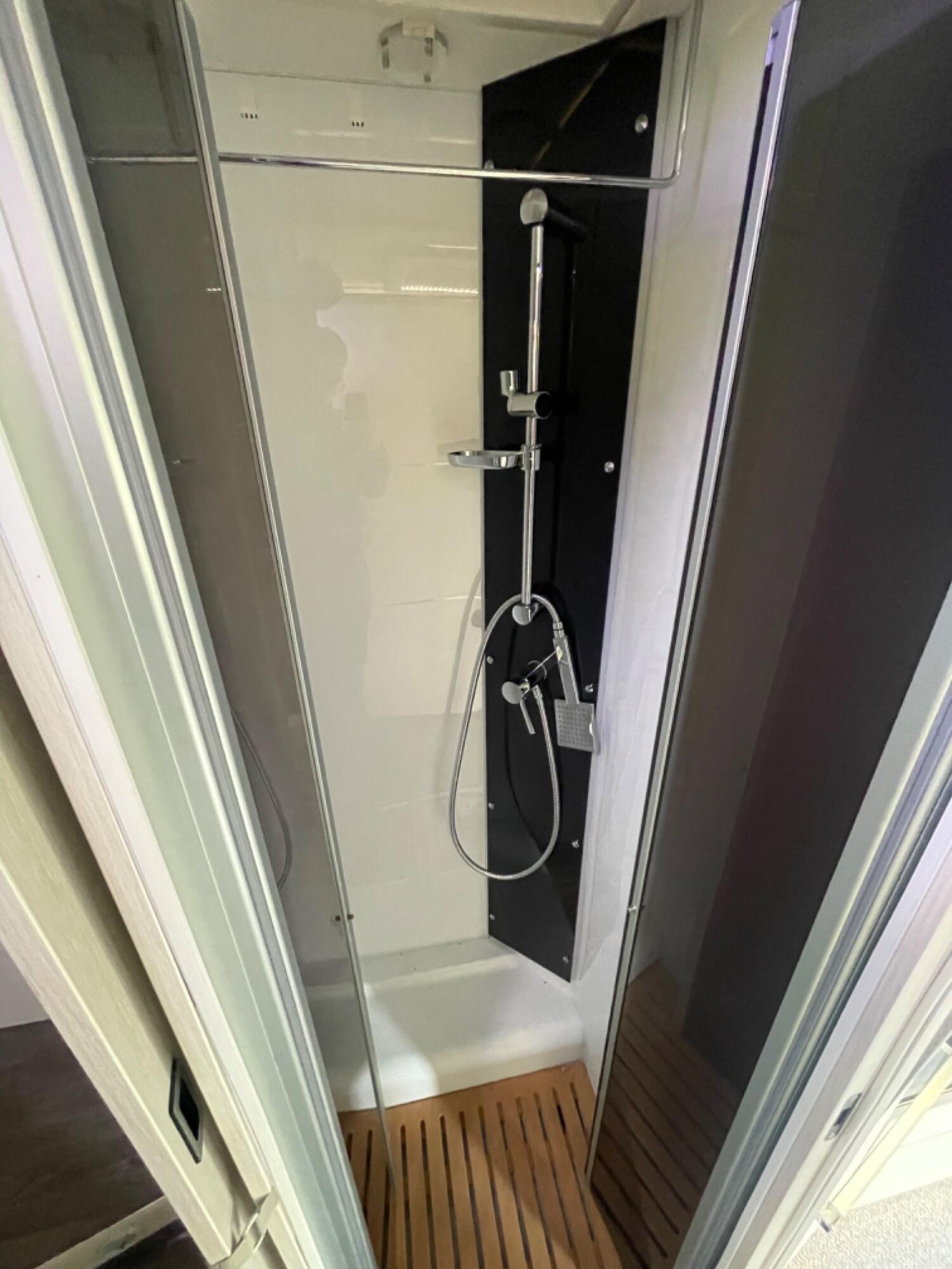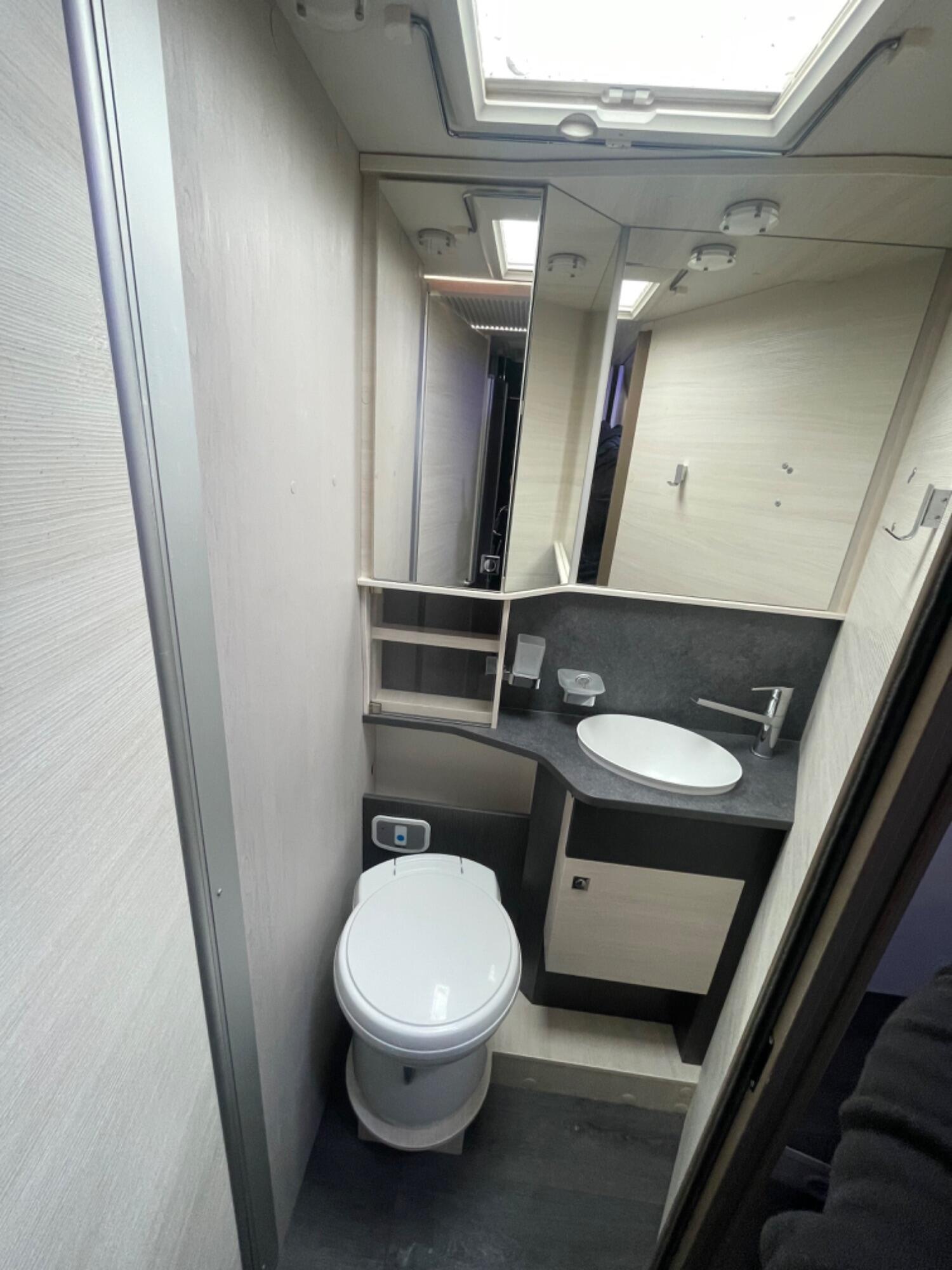 Well-designed washroom with a cassette toilet and washbasin on one side, and a separate step-in shower on the other. The washroom can be closed off from both the bedroom and lounge for privacy.