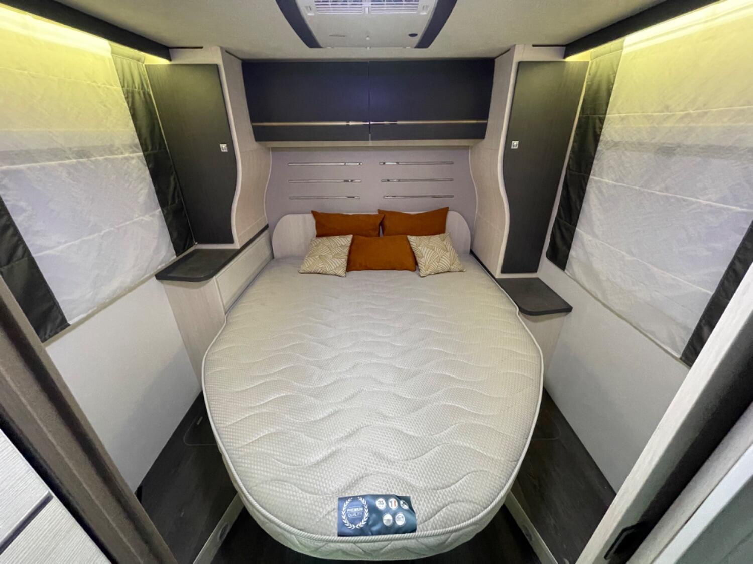 Fixed island bed at the rear with adjustable height and generous storage, including access to the large rear garage.